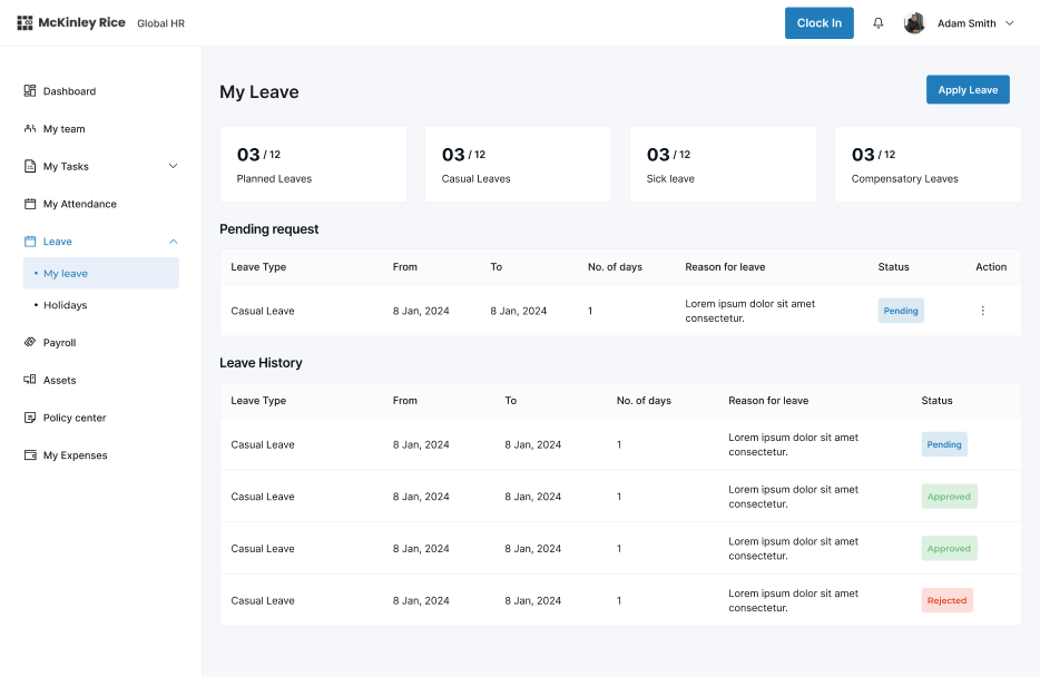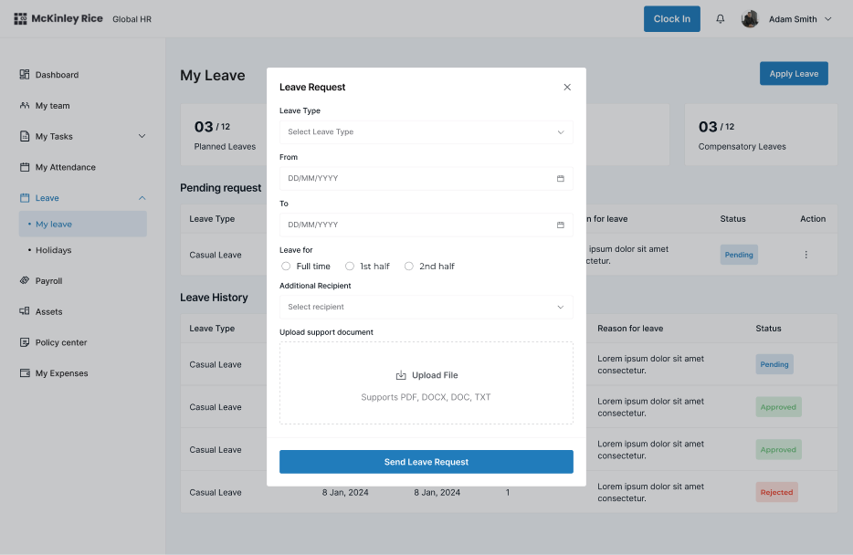 Shifted to form-first flow with leave balance clearly visible at the top. Simple dropdown for leave type, date picker, and one-click submit.