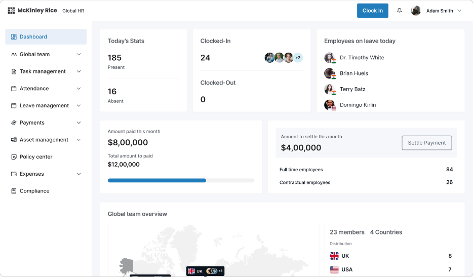 Task Management, Leave Management, Asset Allocation, Global Payroll, Team Management, Expense Management