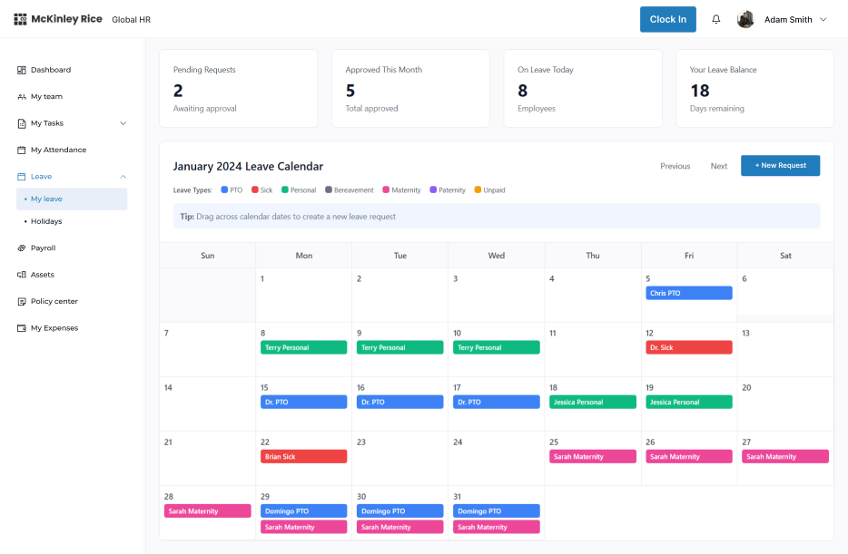 Calendar-first UI where employees could drag-and-drop leave blocks directly onto dates, with color coding by leave type.